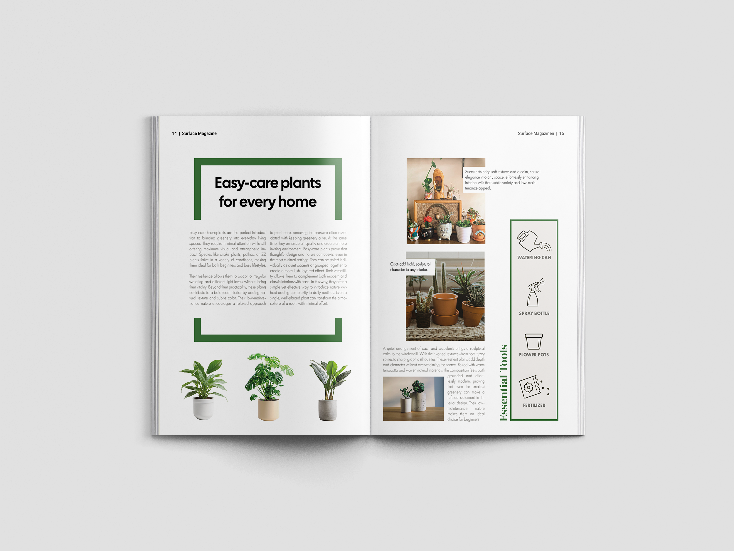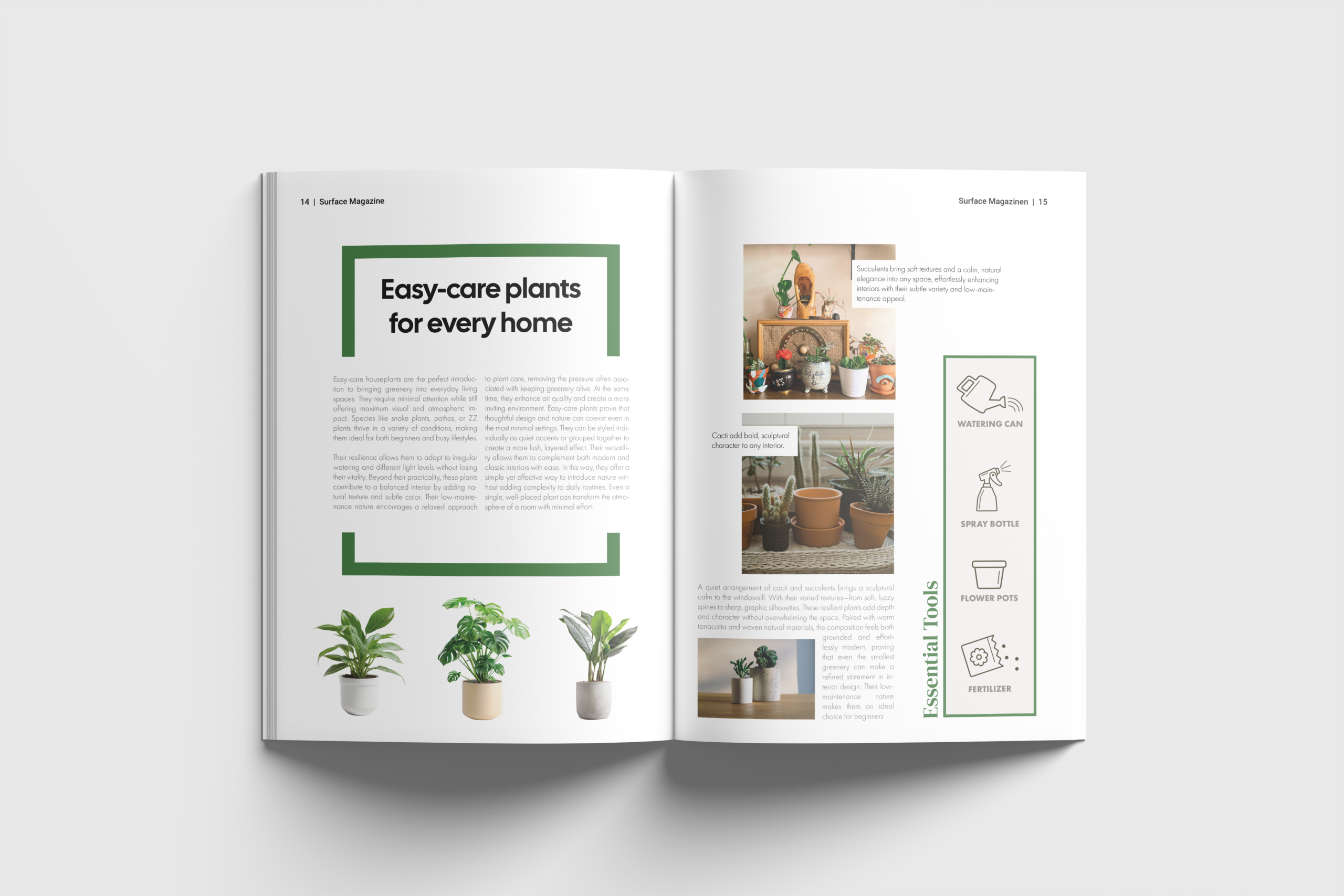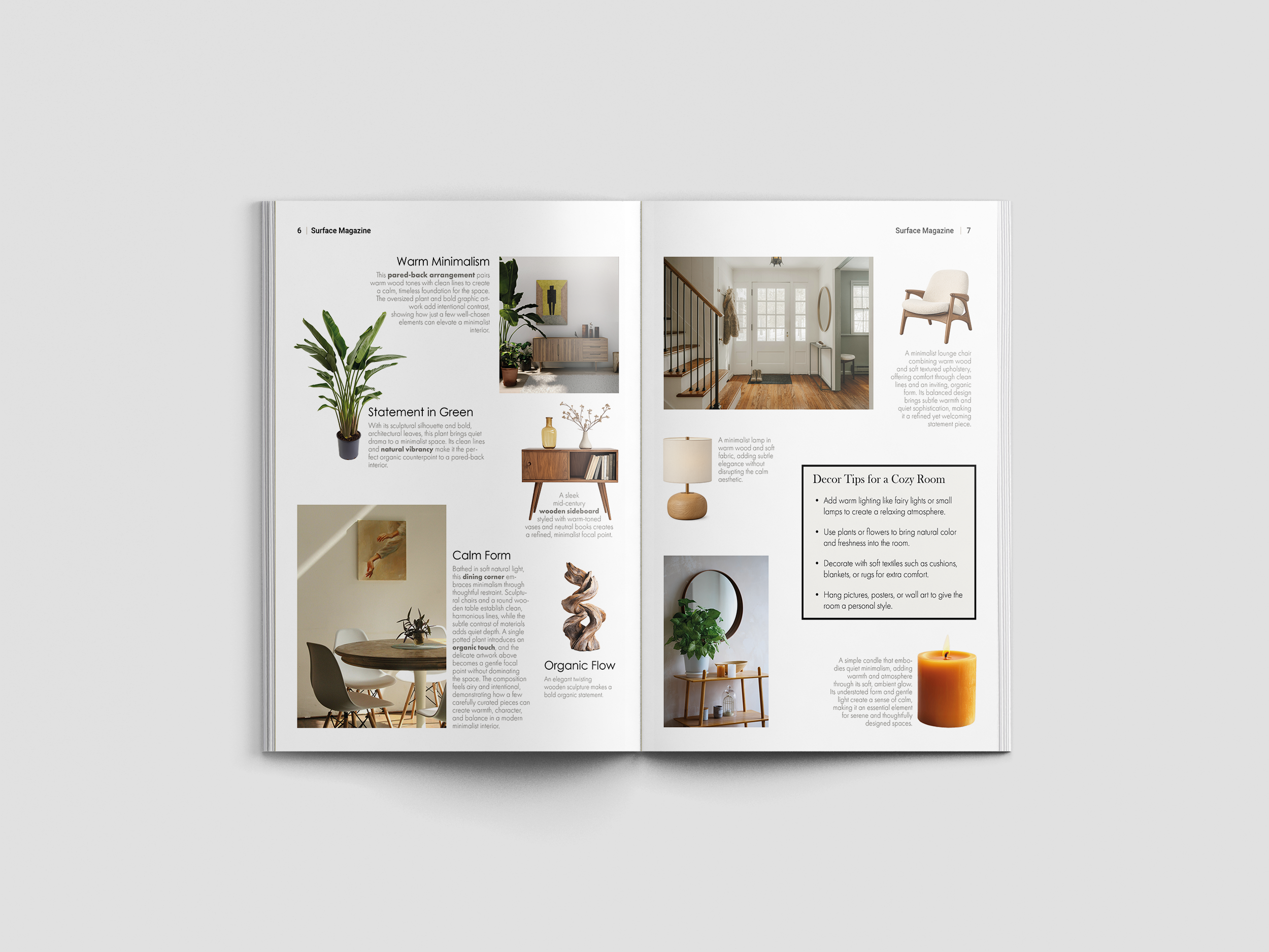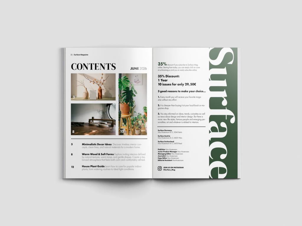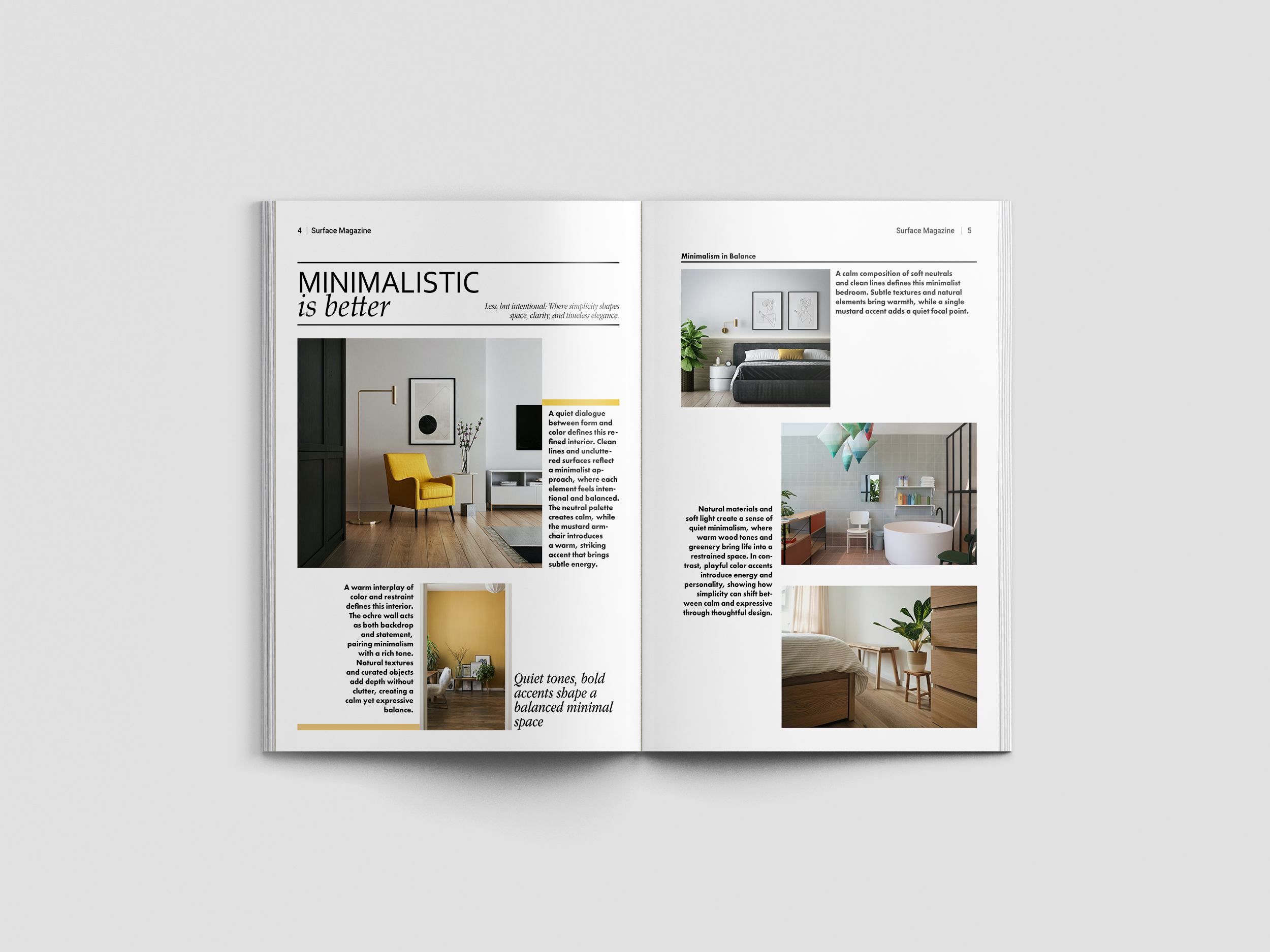 The images used in the magazine are sourced from Unsplash and are free to use. They were selected carefully to support the overall visual direction and to reflect the themes of materiality, space, and atmosphere.